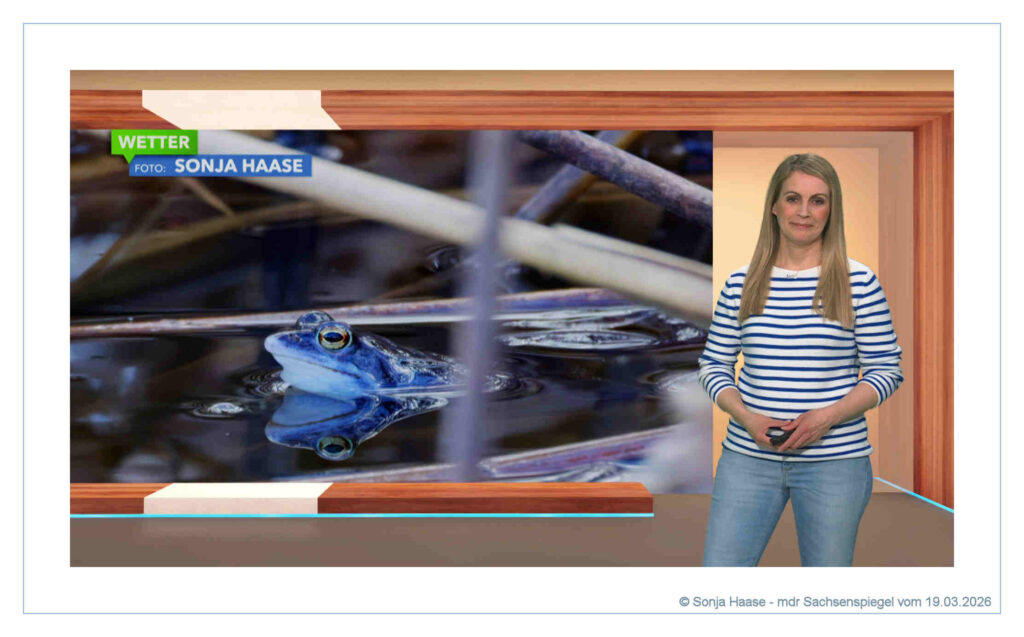 Mit freundlicher Genehmigung von Frau Susanne Langhans und dem MDR : Wetterbilder vom MDR Sachsenspiegel am 19.03.2026. Insgesamt zeigte Frau Langhans 3 Moorfroschfotos ( Rana alvaris) von mir.