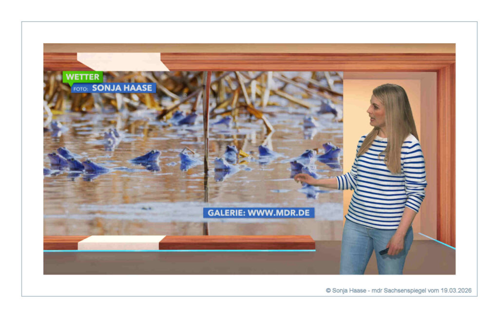 Mit freundlicher Genehmigung von Frau Susanne Langhans und dem MDR : Wetterbilder vom MDR Sachsenspiegel am 19.03.2026. Insgesamt zeigte Frau Langhans 3 Moorfroschfotos ( Rana alvaris) von mir.